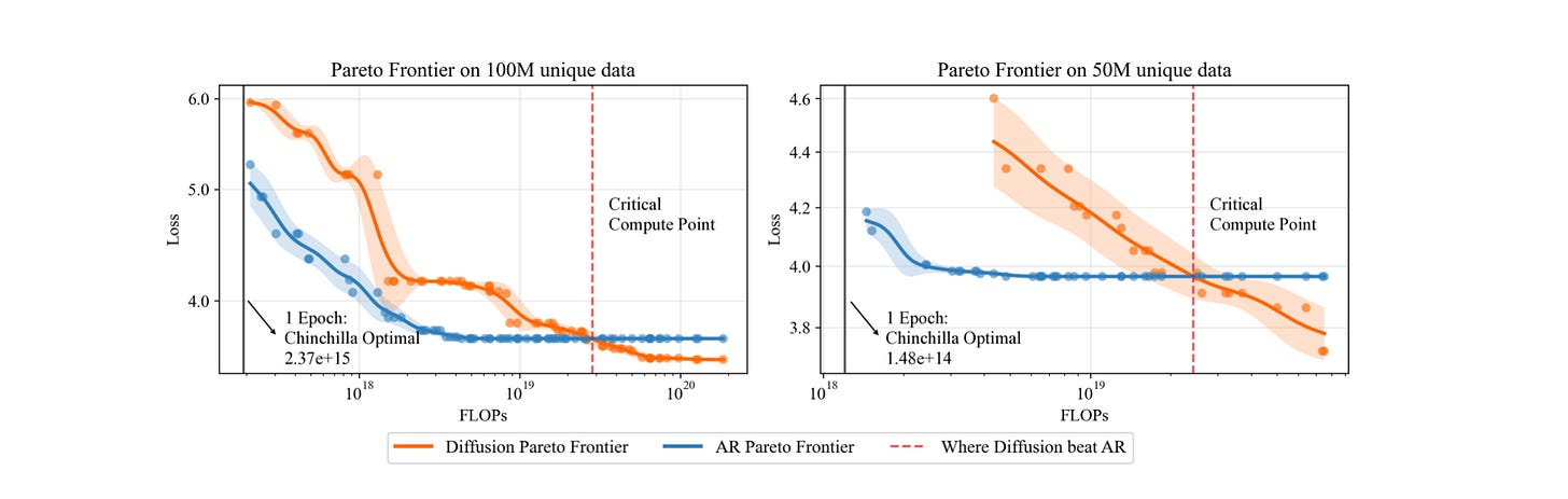 A critical compute threshold is identified, beyond which diffusion models outperform AR models.