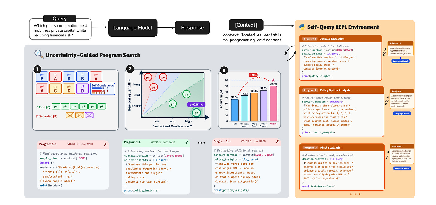 SRLM improves long-context reasoning by combining recursive sub-queries with uncertainty-aware self-reflection. Instead of using fixed heuristics to pick the best reasoning path, it uses the model’s own confidence signals to select the most reliable answer.