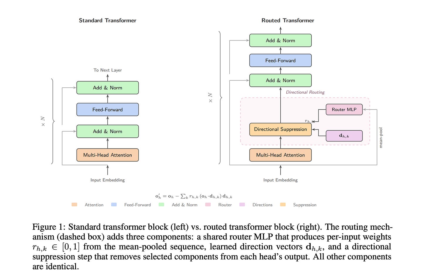 A lightweight mechanism (+3.9% params, +0.02% FLOPs) that gives each attention head 4 learned “directions to suppress,” controlled by a shared MLP router. The router becomes so central to the model that disabling it collapses factual recall to near-zero, while knocking out any individual head has negligible effect.